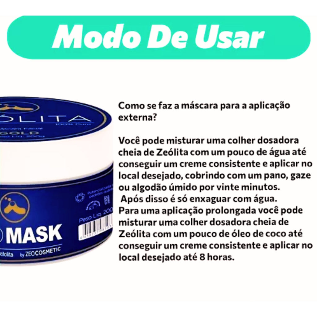 Misture uma colher dosadora cheia de Zeólita com um pouco de água até formar um creme consistente e aplique no local desejado, cobrindo com um pano, gaze ou algodão úmido por vinte minutos. Enxágue com água. Para uma aplicação mais prolongada, misture com um pouco de óleo de coco e aplique no local desejado até 8 horas.